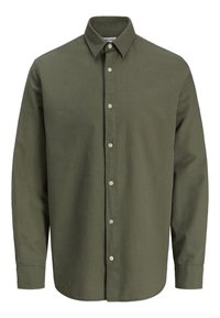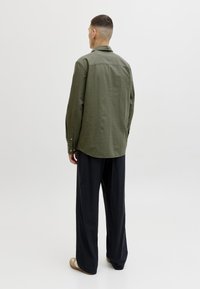 Mladý muž s krátkymi vlasmi, oblečený v zapnutú olivovozelenú košeľu s dlhými rukávmi a čierne nohavice, stojaci pred jednoliatym pozadím.