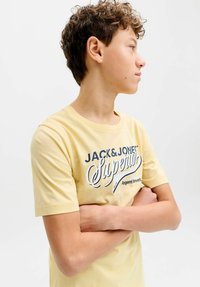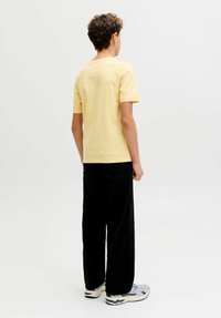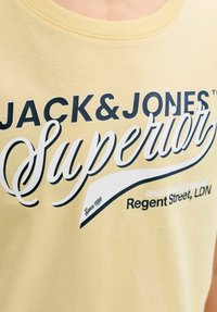 Žlté bavlnené tričko s nápisom "JACK & JONES Superior" v tmavomodrej farbe, skombinované s čiernymi voľnými nohavicami a sivými teniskami.