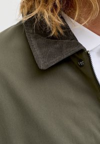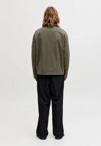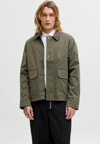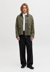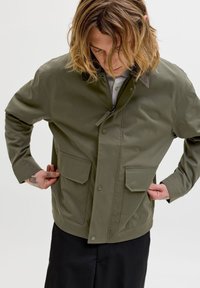 Mladý muž s blond vlasmi po plecia, oblečený v olivovo zelenej bunde s náprsními vreckami, bielom tričku a čiernych nohaviciach, stojaci pred jednoduchým pozadím.