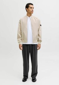 Muž v béžovej bomber bunde na zips cez biele tričko a tmavé skladané nohavice stojaci na neutrálnom pozadí.