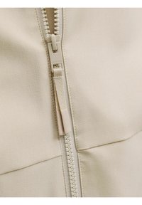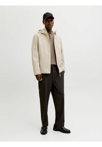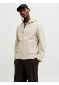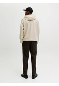 Muž v béžovej mikine na zips s kapucňou, čiernych nohaviciach a čiernej čiapke stojí pred jednoliatym bielym pozadím.