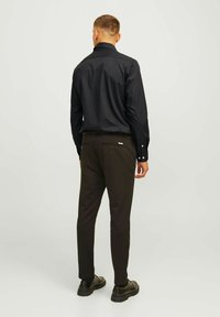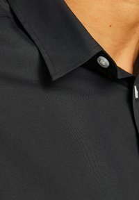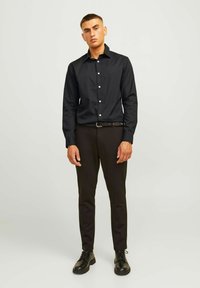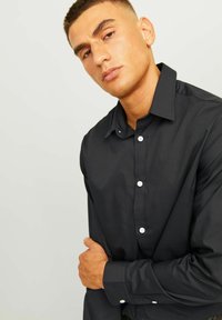Mladý muž s krátkymi vlasmi, ktorý má na sebe priliehavú čiernu košeľu s dlhým rukávom zapnutú na gombíky, zastrčenú do čiernych nohavíc so zapleteným opaskom.
