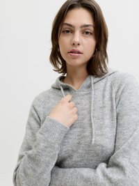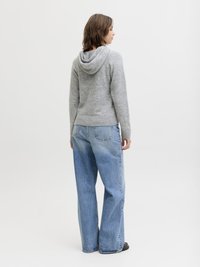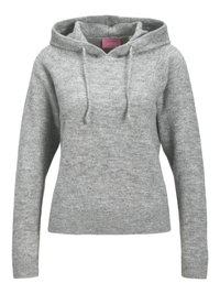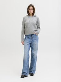 Mladá žena v svetlosivej pletenej mikine s kapucňou a šnúrkami a modrých džínsach s vysokým pásom, stojaca s jednou rukou vrecku.