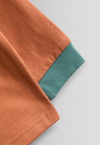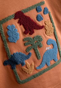 Oranžová bavlnená mikina so zelenými detailmi, s textúrovaným motívom dinosaura v rôznych farbách na prednej strane. Dlhé rukávy a okrúhly výstrih.