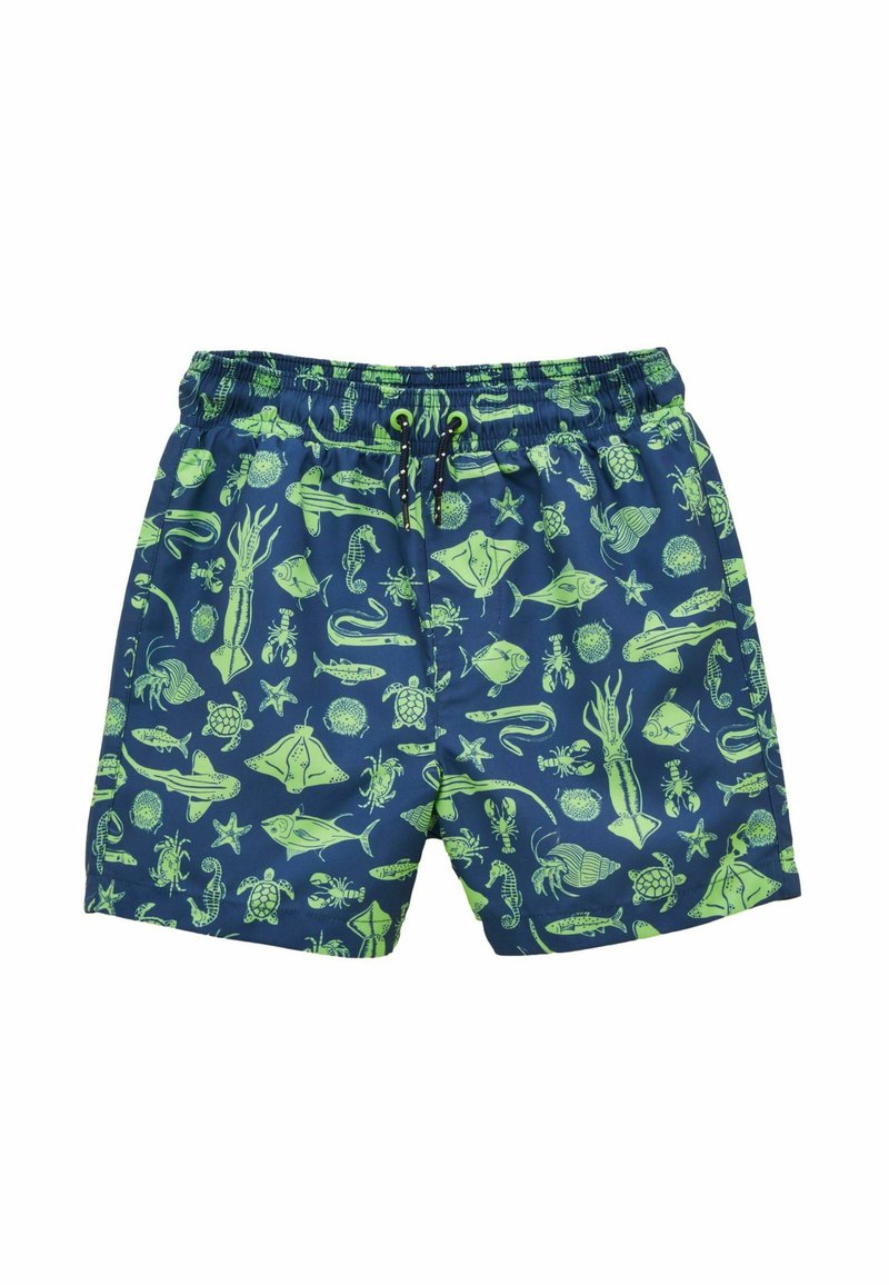 Tmavomodré plavecké šortky so zelenými vzormi morských živočíchov, vrátane rýb, korytnačiek, koníkov morských a hviezdic; elastický pás s čiernym šnúrkou na stiahnutie.