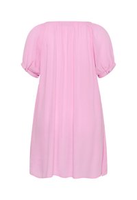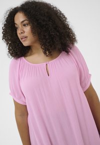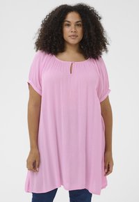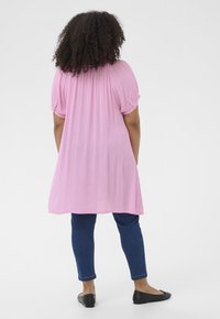 Žena s kučeravými vlasmi, oblečená v voľnej svetloružovej tunike s krátkym rukávom cez tmavomodré džínsy na jednolkom pozadí.