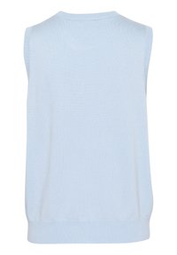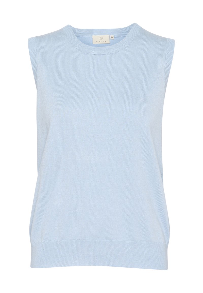 Svetlo modrý bezrukávový top vyrobený z jemnej pleteniny, ktorý má okrúhly výstrih a priliehajúci spodný lem s jemným rebrovaním.
