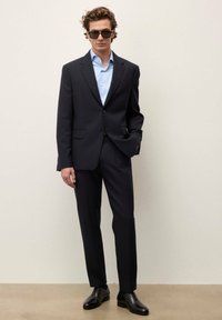 Muž oblečený v čiernom obleku s bledomodrou košeľou, čiernymi spoločenskými topánkami a tmavými slnečnými okuliarmi, stojí pred jednoduchým svetlým pozadím.