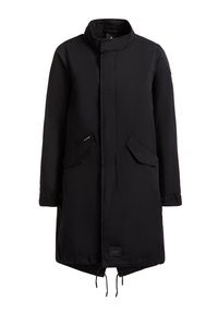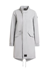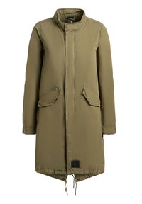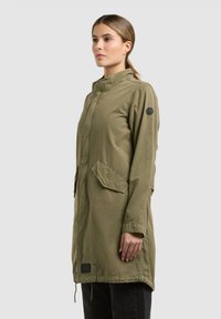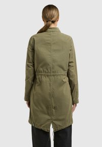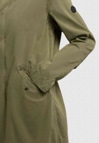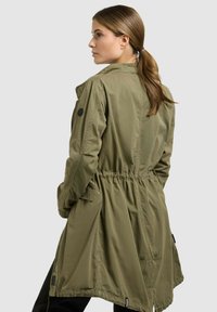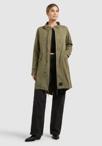 Žena v dlhej olivovo zelenej bunde s klopovými vreckami stojaca na jednoduchom svetlosivom pozadí.