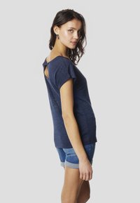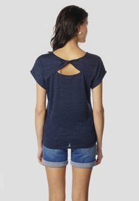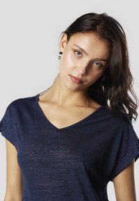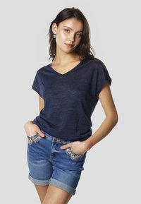 Tmavomodré tričko s výstrihom do V a krátkymi rukávmi, vyrobené z mäkkej, ľahkej látky, skombinované s džínsovými šortkami s obrúbenými nohavicami.