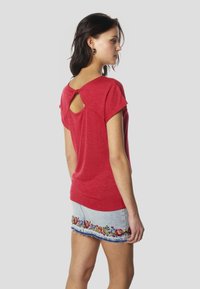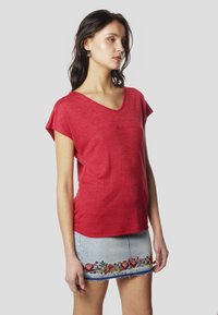 Červené tričko s krátkym rukávom a výstrihom do V so svetlou textúrou, s jemne vyšívaným logom. Nosené s rifľovou sukňou zdobenou kvetinovou výšivkou.