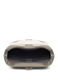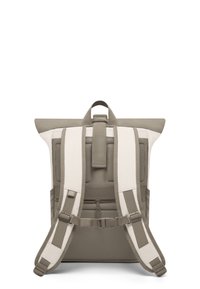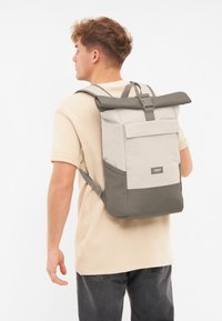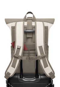 Žena s béžovo-olivovým batohom s rolovacím viečkom, oblečená v bledoružovej mikine a svetlomodrých džínsoch, zobrazená zboku a zozadu.