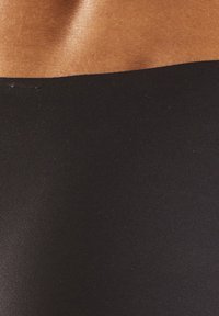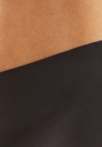 Záber zblízka na opálenú pokožku nad pásom čierneho odevu, zobrazujúci hladkú textúru a detaily látky.