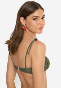 Mladá žena v olivovozelenom bikinovom topu s viazaním na krku a veľkými červenými náušnicami v tvare hviezdice, pózujúca na bielom pozadí.