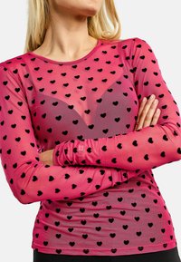 Ružový sieťovaný top s dlhým rukávom s vzorom malých čiernych sŕdc. Materiál je mierne priehľadný, s priliehavými manžetami a okrúhlym výstrihom.