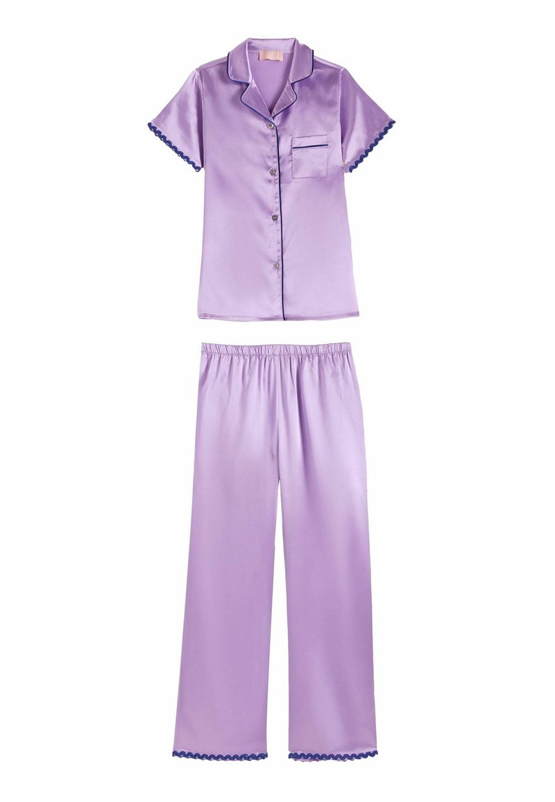 Fialový saténový pyžamový top s krátkym rukávom, zapínaný na gombíky vpredu a s náprsným vreckom, doplnený o zodpovedajúce nohavice s elastickým pásom, oba ohraničené tmavými vlnkovanými lemami.
