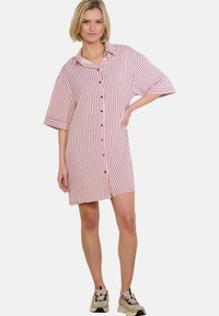 Žena v voľných, kolená dĺžkach bielych šatách s tenkými zvislými červenými pruhmi a zlatým retiazkou na krku, stojaca s rukami za chrbtom.