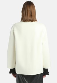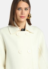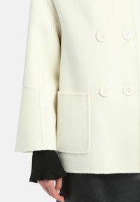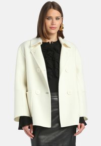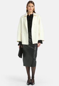 Biely kabát zo zmesi vlny s dvojitým zapínaním, veľkými gombíkmi a bočnými vreckami, nosený cez čierny volánikový sveter a čiernu koženú sukňu.