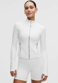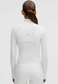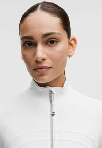 Biela atletická bunda s vysokým golierom, predným zipsom a dvoma bočnými vreckami. Dlhé rukávy majú otvory na palce a priliehavý strih.