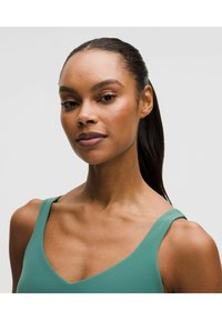 Žena s tmavými vlasmi v cope, oblečená v tyrkysovom priliehavom krátkom top a legínach s vysokým pásom, na jednoduchom svetlom pozadí.