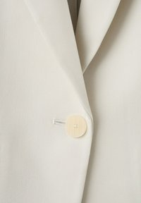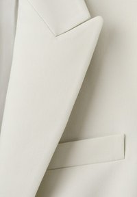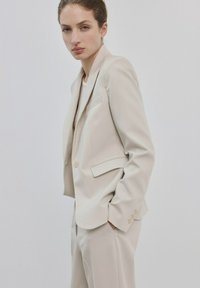 Žena stojaca opretá o bielu stenu, oblečená v béžovom obleku so zodpovedajúcimi nohavicami, sako, krémovým rebrovaným topom a čiernymi lodičkami na vysokom podpätku.