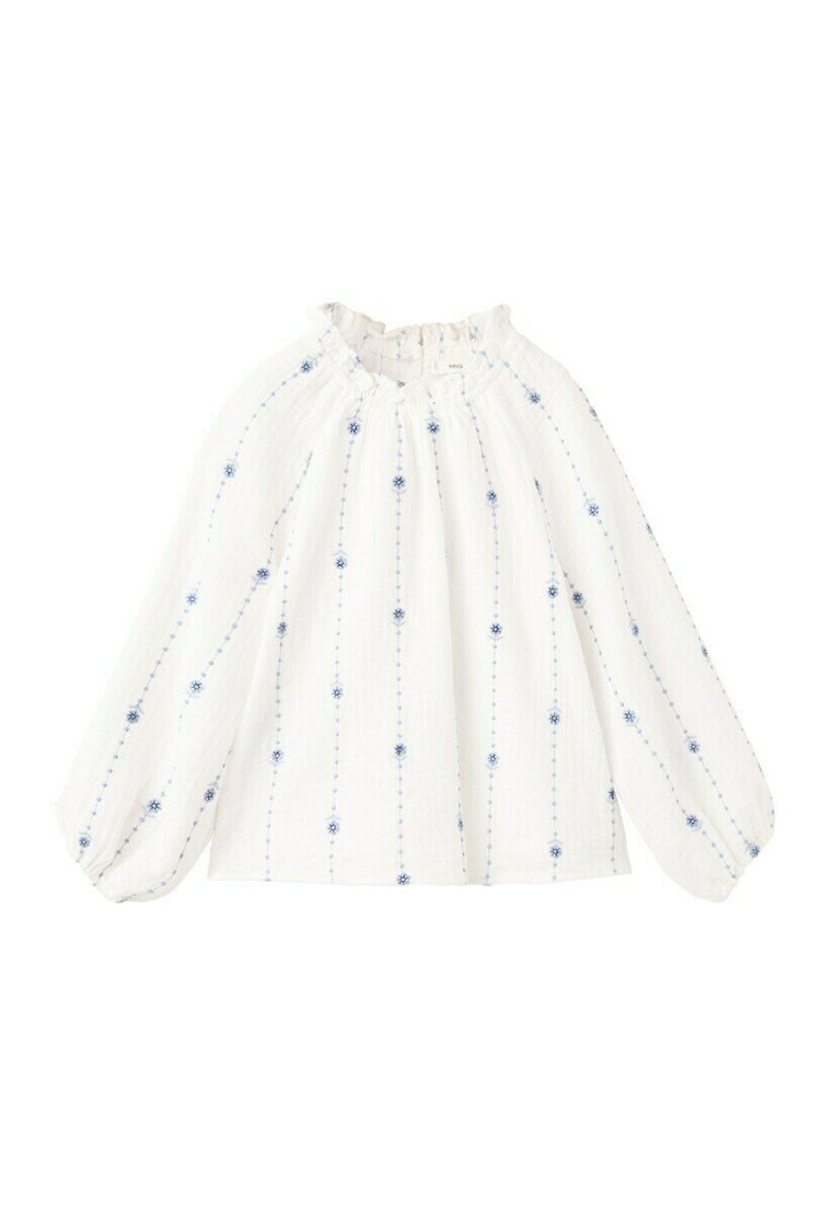 Biela blúzka s dlhými rukávmi, s nariaseným výstrihom a modrou zvislou kvetinovou výšivkou.