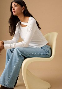 Biely dlhý rukáv s asymetrickým výstrihom a detailom na ramienku, v kombinácii so svetlomodrými širokými džínsami. Hnedé topánky dopĺňajú outfit.