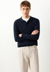 Mladý muž stojí, oblečený v tmavomodrom polo tričku s dlhým rukávom, bielom tričku pod ním, svetlo béžových nohaviciach a hnedých pohodlných topánkach, na pozadí bielej steny.