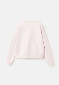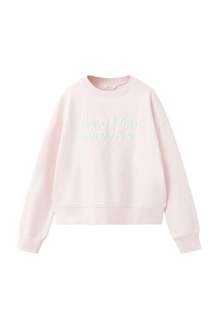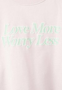Svetloružová mikina s okrúhlym výstrihom a dlhými rukávmi, na prednej strane s nápisom „Love More Worry Less“ svetlým textom.