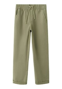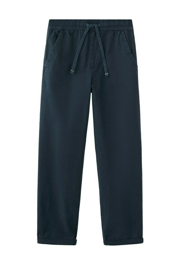 Tmavomodré ležérne nohavice s elastickým pásom, šnúrkou, bočnými vreckami a vyhrnutými lemami.