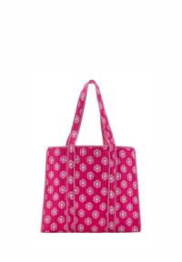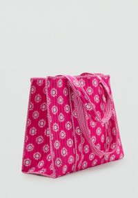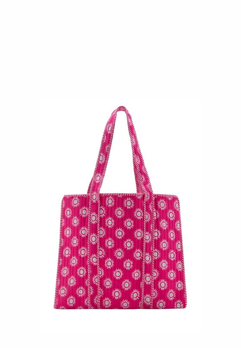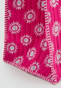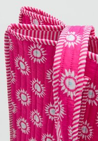 Ružová taška cez rameno s bielymi vzormi pripomínajúcimi slnečné lúče a dvoma dlhými uchami, vyrobená z prešívanej látky.