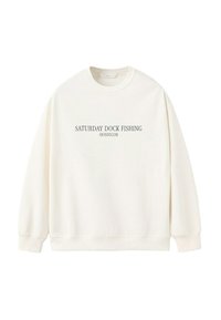 Biela mikina s okrúhlym výstrihom, s rebrovanými manžetami a pásom, s potlačeným textom "SATURDAY DOCK FISHING HOSSEGOR" umiestneným v strede na prednej strane.
