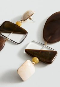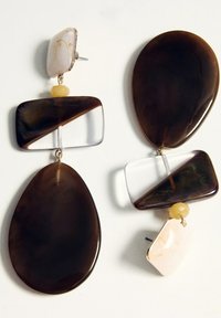 Náušnice s krémovými štvorcovými vrchmi, malými žltými korálkami, polovica hnedých a polovica priehľadných obdĺžnikových blokov a veľkými hustými hnedými kvapkovými príveskami.