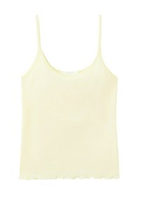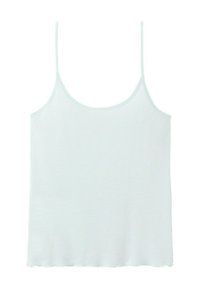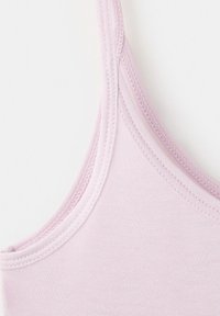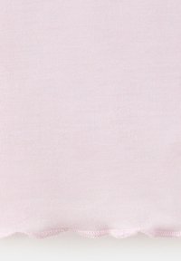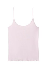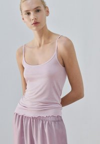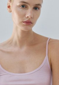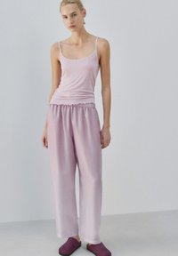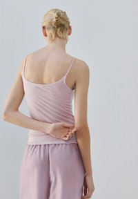 Mladá žena s blond vlasmi má na sebe svetloružové tielko a zodpovedajúce voľné nohavice, stojaca na jednoduchom sivom pozadí.