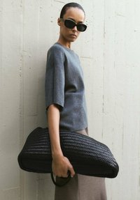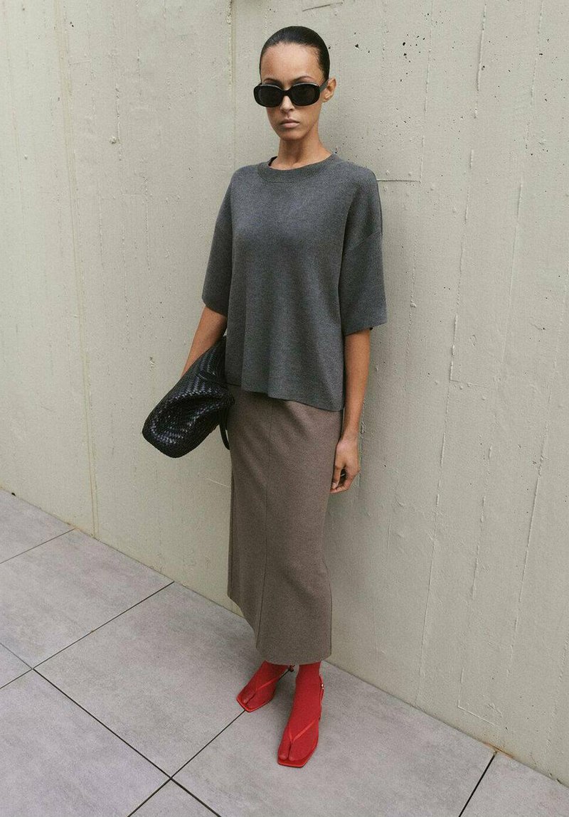 Žena v nadrozmernej sivej blúzke, taupe midi sukni, červených topánkach so štvorcovou špičkou, čiernych slnečných okuliaroch, drží čiernu tkanú kabelku opretú o sivú stenu.