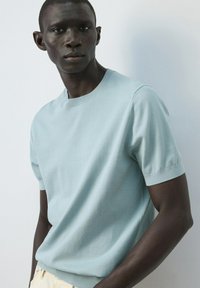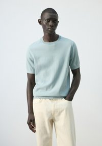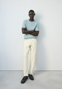 Muž v svetlomodrom svetri s krátkym rukávom a krémových nohaviciach stojí s jednou rukou v vrecku na pozadí hladkej bielej steny.