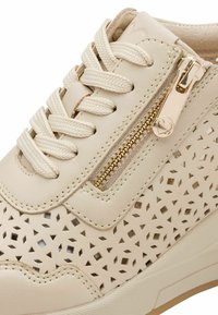 Béžové klinové tenisky s perforovaným koženým zvrškom, kovovými detailmi, šnúrkami vpredu a bočným zipsom pre jednoduché obúvanie. Podošva z gumy pre lepšiu trakciu.
