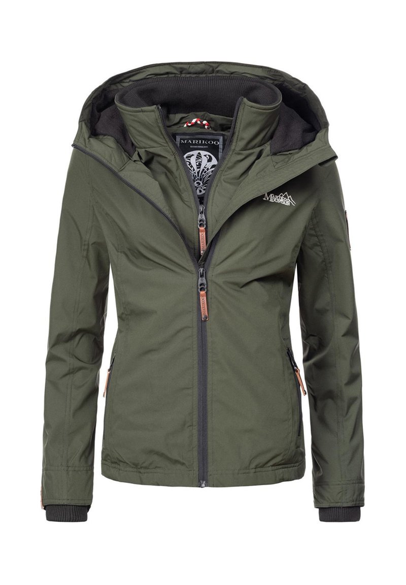 Olivovo zelená vonkajšia bunda s kapucňou, čiernou vnútornou podšívkou, predným zipsom, zipsovými bočnými vreckami a logom Mountain na ľavej strane hrudníka.