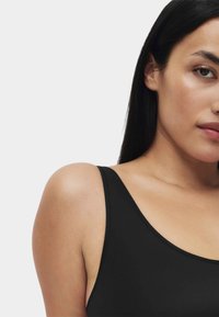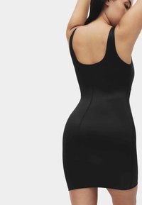 Žena v čiernych obtiahnutých šatách bez rukávov pózuje s rukami zdvihnutými a nohami mierne prekríženými na jednotnom pozadí.