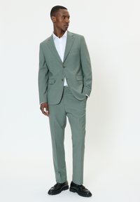 Svetlozelený oblek s textúrovanou látkou. Jednoduché zapínanie na gombík, zárezové klopy a bočné vrecká. Nosí sa s bielou košeľou pod ním.