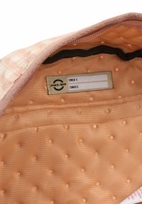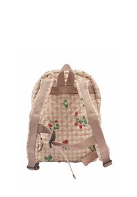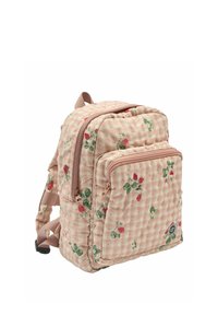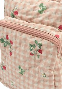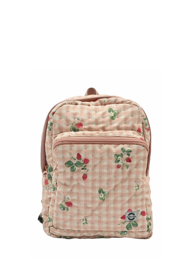 Malý polstrovaný batoh s ružovým kockovaným vzorom a roztrúsenými červenými jahodami a zelenými listami, predný vrecko na zips a textilné držadlo.