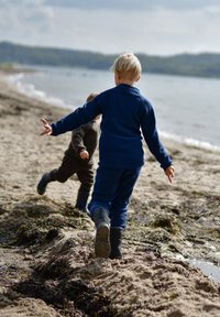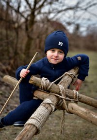 Dieťa v tmavomodrom svetri a čiapke sediace na rustikálnej drevenej konštrukcii, drží vetvičku. Charakterizované povrazovými akcentmi a prírodnými textúrami.