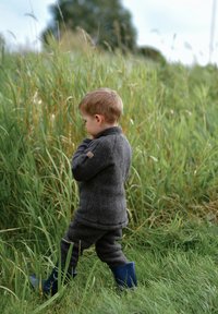 Dieťa oblečené v tmavosivom vlnenom odeve s vyhrnutými manžetami a modrými gumáčmi, stojace v vysokej zelenej tráve. Pohľad zozadu.