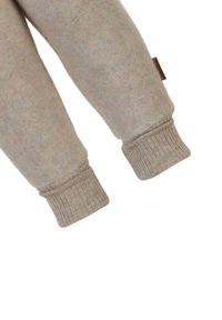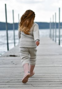 Sivý fleecový sveter a zodpovedajúce nohavice, s ružovými gumovými čižmami. Čižmy majú logo a textúrované podrážky, pohľad zozadu na drevenom móle.