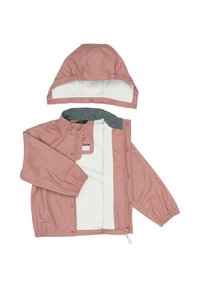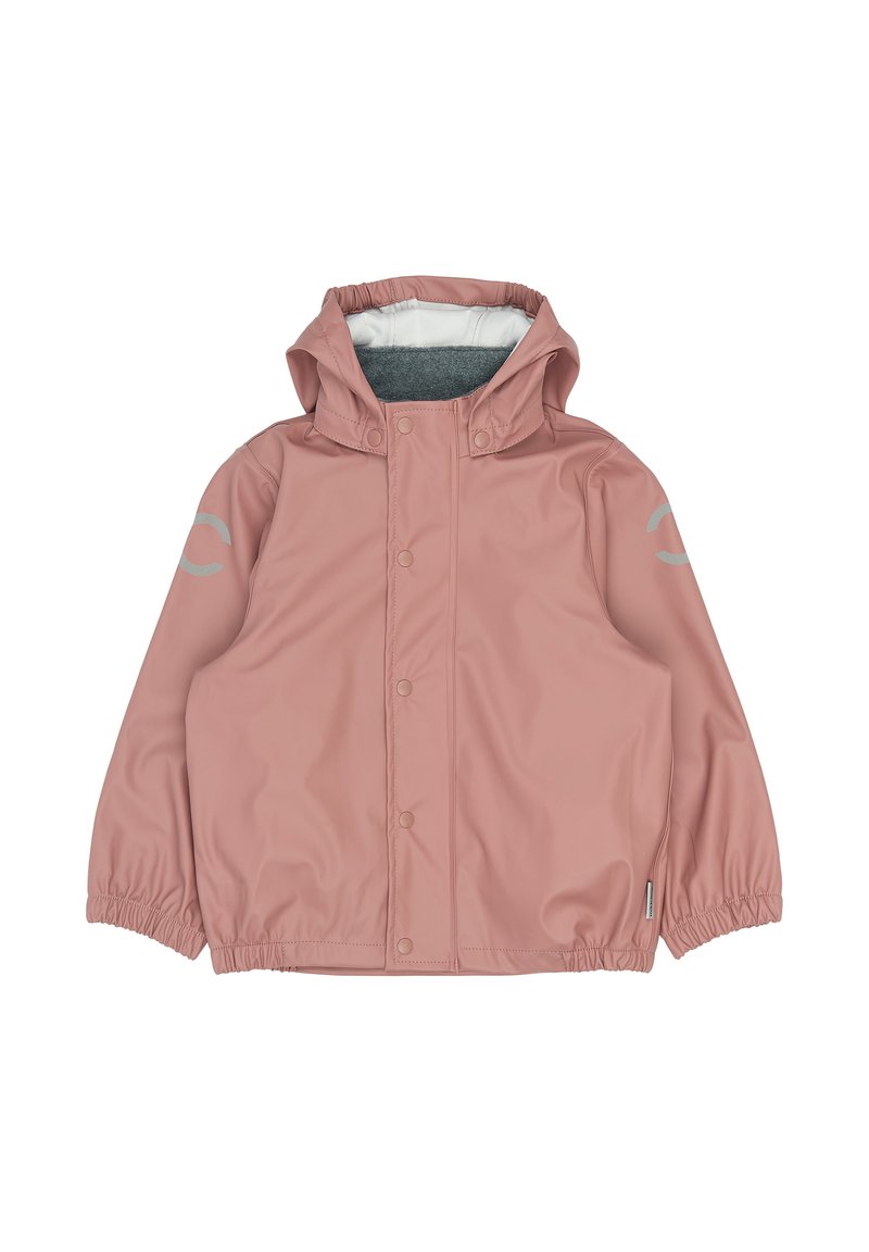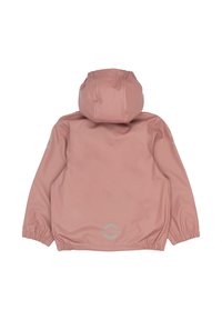Ľahká ružová detská pršiplášťová bunda s kapucňou, patentnými gombíkmi, elastickými manžetami a reflexnými prvkami na rukávoch.