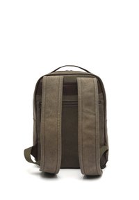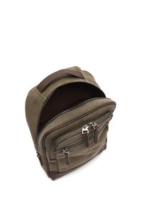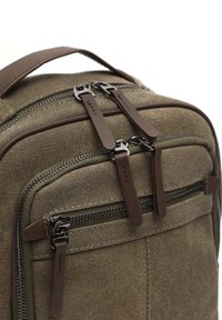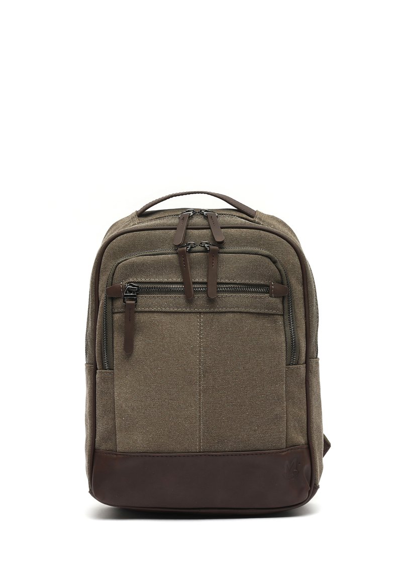 Hnedý batoh z plátna a kože s viacerými priehradkami na zips a horným držadlom, stojaci vzpriamene na bielom pozadí.
