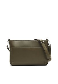 Čierna kožená crossbody taška s hladkým povrchom, obdĺžnikovým tvarom, nastaviteľným popruhom a zlatými akcentmi. Obsahuje detail predného vrecka.