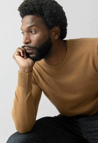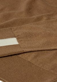 Hnedý pletený sveter s dlhým rukávom a rebrovanými manžetami, nosený osobou sediacou na jednoduchom bielom pozadí. Viditeľné tmavé džínsy.