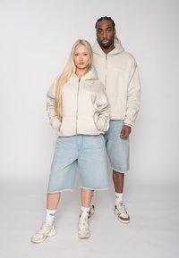 Dvaja modely majú na sebe svetlobéžové mikiny s kapucňou s nápisom "MULTIPLY"; jeden stojí čelom dopredu, druhý ukazuje zadnú stranu s logom značky, obaja v svetlom rifľovom oblečení dole.