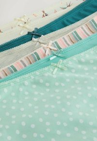 Sedem párov dámskych bavlnených nohavičiek v štýle krátkych nohavičiek v bielej, tyrkysovej, sivej, pruhovanej a vzorovanej farebnej kombinácii, usporiadaných v zvislom rade.
